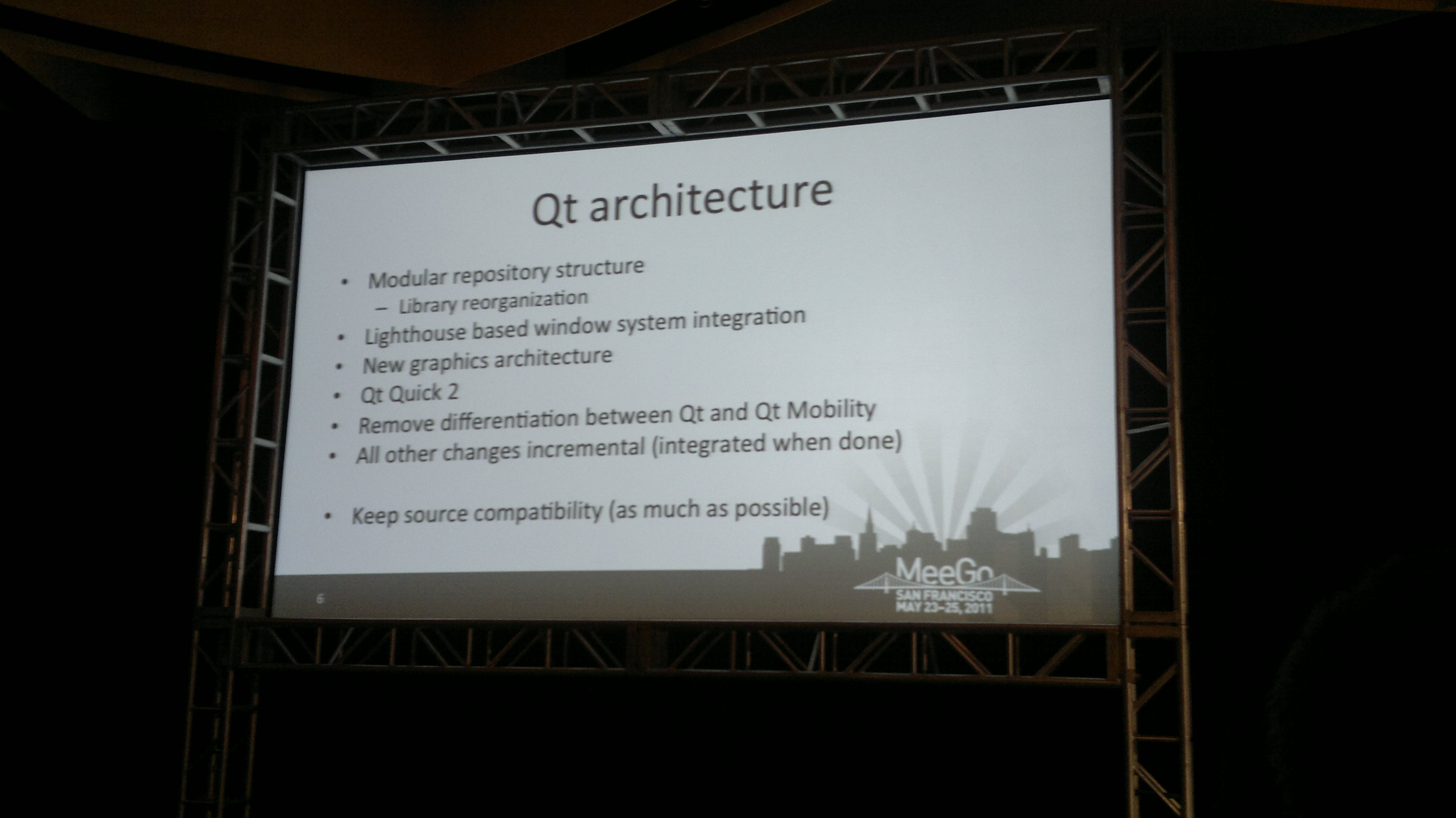 Qt 5 に関する BoF (議論の)セッションがありました。現在の Qt の開発チームだけではなく、様々な会社やコミュニティの方が参加して、これから Qt 5 をどうして行くのかについての熱い議論が交わされました。中でも盛り上がったのは MeeGo 1.3 では Tablet UX を Wayland で動かすという目標に関連して、MeeGo 1.3 で Qt 5 を前倒しで使えないか、Qt 5 自体が無理でも QML SceneGraph を Qt 4 に移植して、それを使えないかという議題でした。また、それを実現する際にバイナリの互換性やレガシーとなる機能(X11)をどのようにするのが良いのかなどについて、かなり具体的な議論がなされました。