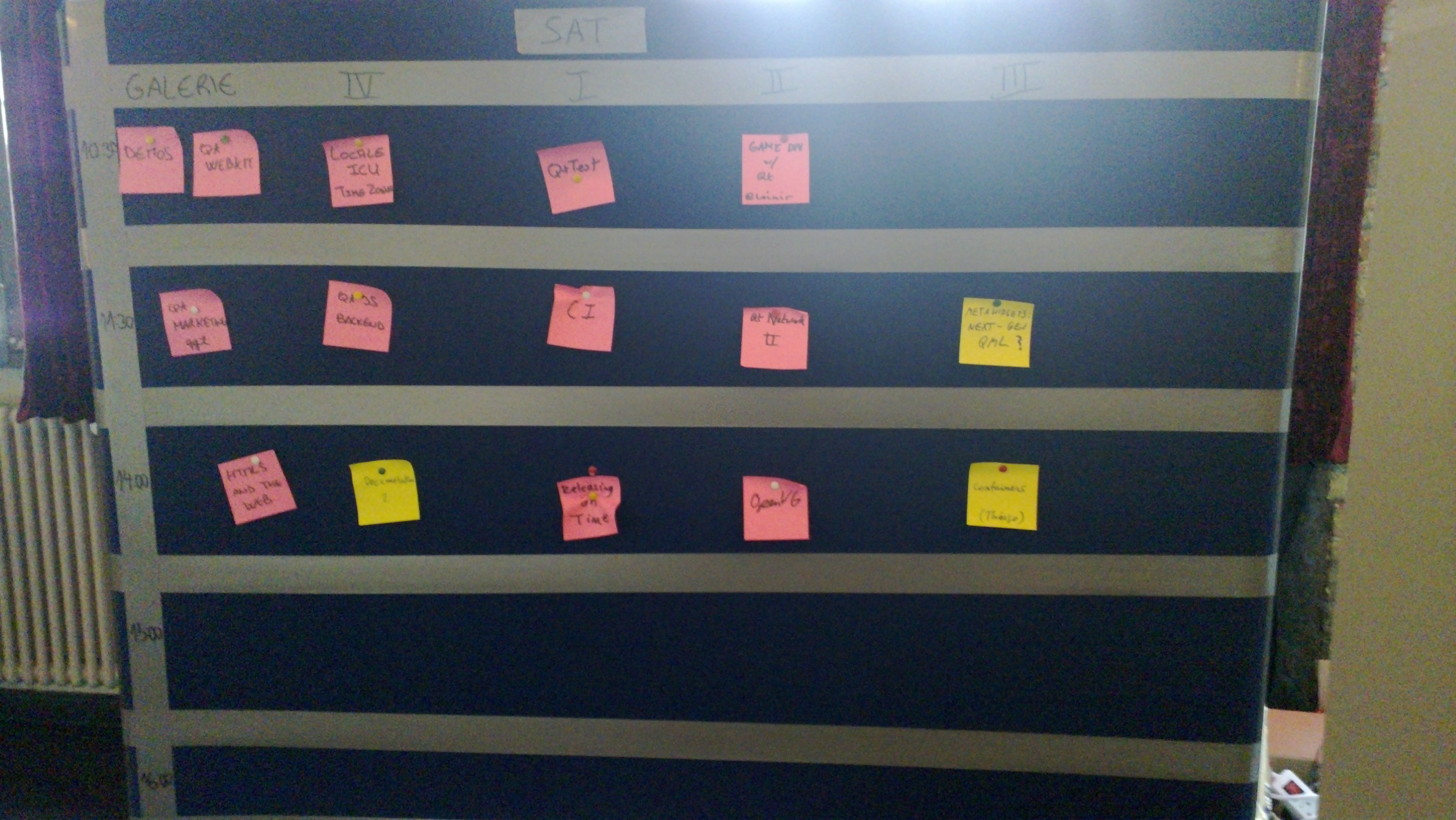 キーノートが終わるといよいよイベントの本番です、Qt 自体の様々な機能やプラットフォームの対応、開発体制など、様々なトピックに関するセッションが開かれました。イベントがはじまった時点で計画されていたセッションはあまり多くはありませんでしたが、何気ない雑談からセッションが発生したり、セッションでの話し合いが時間内に終わらず、次の日に続きをするといった形でだんだんと埋まっていきました。