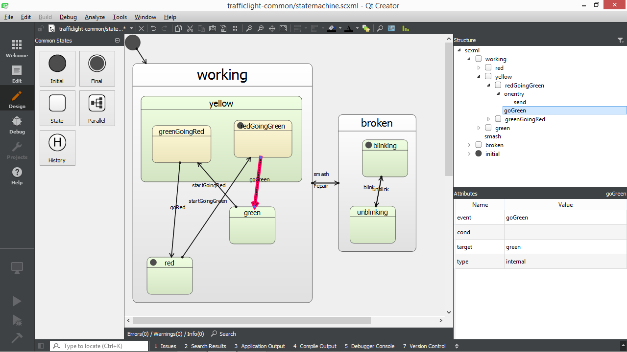 Qt Creator 4.2 では SCXML のグラフィカルエディタ を(実験的に)追加しました。ステート、サブステート、トランジション、イベントとすべての種類のプロパティの編集に対応しています。このエディタは実験的な機能のため、プラグインはデフォルトでは無効になっています。試す場合は ヘルプ > プラグインについて... (macOS の場合は Qt Creator > プラグインについて) より有効にしてください。