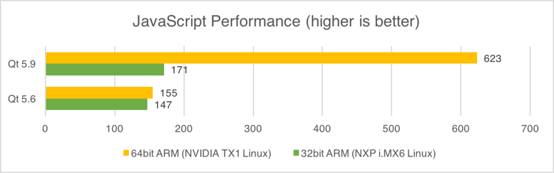Qt 5.9 LTS での QML エンジンの改善により、JavaScript の実行時のパフォーマンスも改善されました。JavaScript をたくさん活用している Qt Quick アプリケーションでは、Qt 5.6 LTS と比較して、特に 64 ビットの ARM では、パフォーマンスが大きく改善されています。JavaScript を大規模に使用している例としては Canvas 3D 上での three.js の利用があげられますが、通常の Qt Quick アプリケーションの JavaScript はそれより小規模になるでしょう。