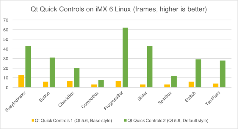このグラフのとおり、パフォーマンスは大幅に改善されています(注:バーの高さが高いほどよいパフォーマンスになっています)。このベンチマークは NXP i.MX6 で行いました。Qt 5.9 LTS の Qt Quick Controls 2 と Qt 5.6 LTS の Qt Quick Controls 1 では、平均して6倍程度パフォーマンスが改善され、以前に比べて 14 倍も改善されたコントロールも存在します。この恩恵を得るためにはアプリケーションの Qt Quick Controls 2 対応が必要になりますが、Qt Quick Controls 2 はほぼすべての基本コントロールを提供しているので、この対応は基本的にはとても簡単な作業になります。対応の際には こちらのドキュメント をご覧ください。TableView など Qt Quick Controls 2 では現在提供していないコントロールも存在します。