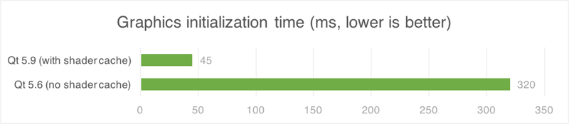こちらの記事で紹介した とおり、Qt 5.9 LTS では初回起動時に OpenGL のシェーダーのキャッシュを生成し、ディスクに保存する機能が追加されました。Qt Quick アプリケーションが OpenGL のシェーダーを利用している場合(これは一般的によくあることです)、これまでの Qt のリリースに対して起動時間の大幅な改善が見られます。Qt 5.6 LTS と Qt 5.9 LTS で、10個のシェーダーを利用した同じアプリケーションでベンチマークを取ると、シェーダーの初期化時間に大幅な改善が見られました。今回の計測で得られた改善の一部は描画の改善によるものですが、ほとんどの部分についてはシェーダーキャッシュ対応によるものになります。