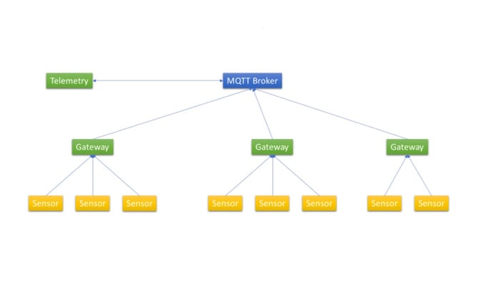 基本的に、複数のセンサーがデータを Bluetooth を利用してゲートウェイ(今回は raspberry Pi 3)に送り、その後クラウド上の MQTT ブローカーに情報を送るといったシナリオでこのデモは動作しています。複数のゲートウェイが組み合わさってセンサーネットワークを形成しています。