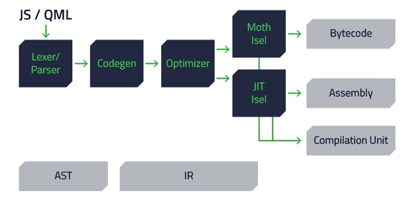 まず QML と JavaScript のコードを 字句解析器(Lexer) と 構文解析器(Parser) に送り、抽象構文木(AST) というコンパイル用のコードに変換します。この AST は Codegen と呼ばれるクラスに送られ、AST から 中間表現(IR) が生成されます。さらに、この IR は様々な最適化のステージを通過します。不必要なコードの削除やいくつかの型の確定、その他様々なトリックが用いられます。