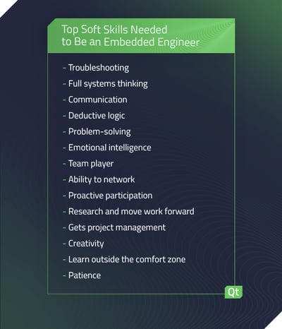 組み込みエンジニアが成功するには、幅広い「ソフトスキル」、つまり技術以外のスキルも必要です。主なソフトスキルとして、ネットワーク作りやコミュニケーション、チームで仕事をする能力といったものが挙げられます。