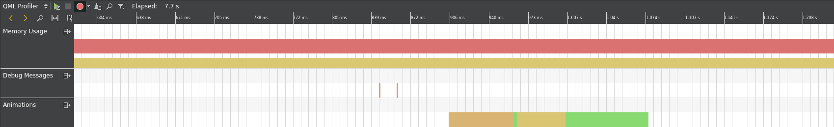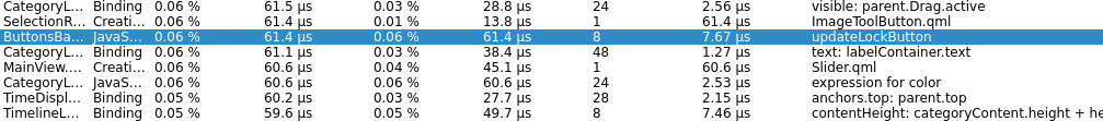 ButtonsBar.qmlは、QML Profiler and Performance AnalyzerのTimelineビューの左上隅にあるボタン列のことです。このボタンにより、イベントのステップ実行やビューのズームが可能です。ここで訴えた関数は、「view event information on mouseover」ボタンがトグルされ、ホバー選択が有効または無効になったときに発動されます。どれくらいの時間がかかるか見てみましょう。