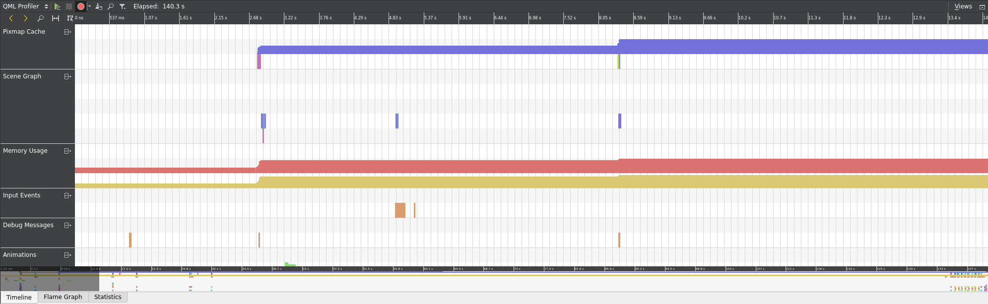 ドロップダウン・メニューの隣にあるツールバーの緑色の三角形の「Start」ボタンを押します。これにより、Qt Creatorの別のインスタンスが起動し、QMLプロファイラがトレースを記録します。ツールバーの "Elapsed "タイムが刻々と変化し、すべてのビューに "Profiling Application "というラベルが表示されることに気づくでしょう。Qt Creatorの追加インスタンスを閉じます。その結果、タイムラインビューには、わずかなイベントしかない退屈なトレースが表示されることになります。