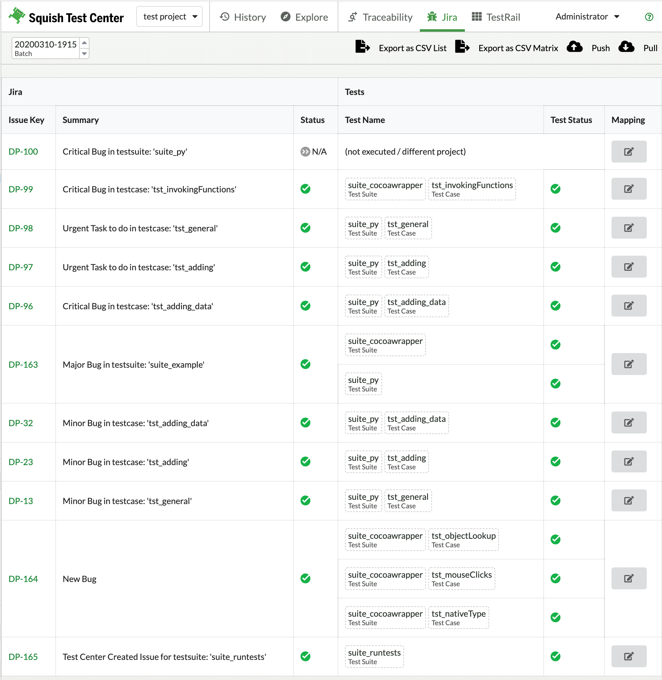 ボタン一つで、JiraのIssue TicketからTest Centerのデータベースに情報を転送することができます。これにより、どのSquishテストがどのJira ticketに関連付けられているかをマッピングすることができます。Test Center に表示される概要ページには、Issue Tickets と関連するテスト ステータスが表示されます。