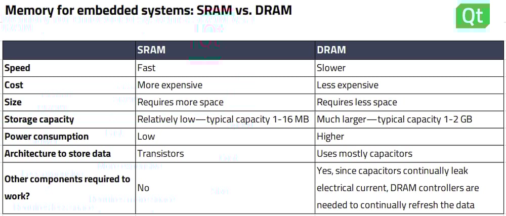 QtのシニアソフトウェアエンジニアであるTimo Aarnipuroは、多くのSoCやMCUではチップ上に少量の内蔵RAMが実装されていると指摘しています。「これは多くの場合、SRAMとCPUキャッシュがSoC上で組み合わされています。一部のチップ製品では、オンチップメモリ構成が異なるバリアントを選択できます。それにより、高速メモリの量が最適であるバリアントをある程度柔軟に選択できるようになっています」 - DRAM:このメモリは、コンデンサーとトランジスターによって情報を保持します。この構成は、その性質上時間経過とともに情報が失われるため、継続的に更新しないとメモリ内のすべてのデータが失われます。DRAMはSRAMよりも低速で、コストも大幅に低くなっています。