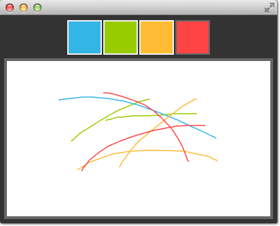 To finally draw the users stroke, in the onPaint handler we begin a new path and move to the last position. Then we gather the new position from the mouse area and draw a line with the selected color to the new position. The mouse position is stored as the new last position.