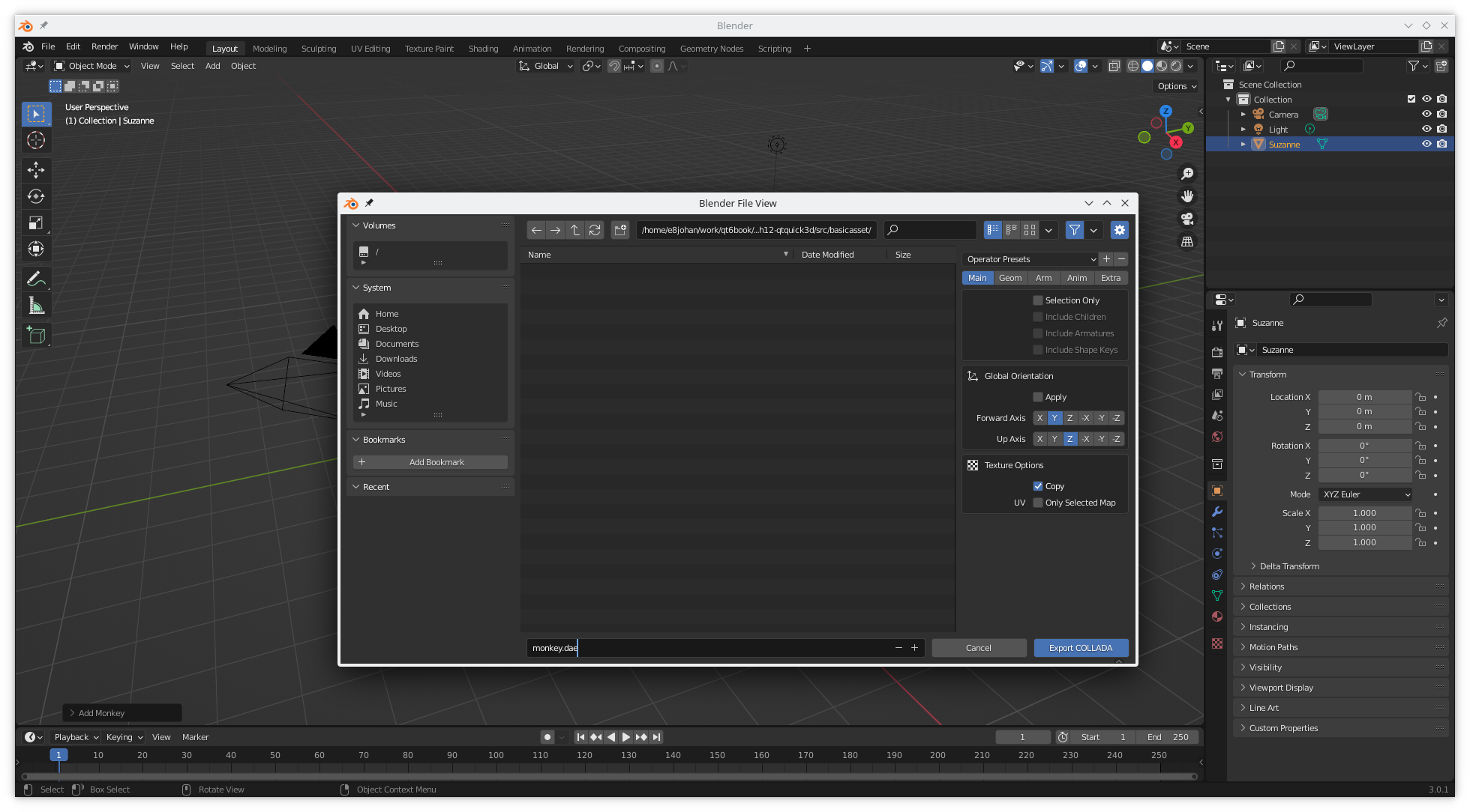 To generate an asset that we can import, we will use Blender to create a scene with a monkey head in it. We will then export this as a COLLADA (opens new window) file to be able to convert it to a Qt Quick 3D friendly file format using Balsam.