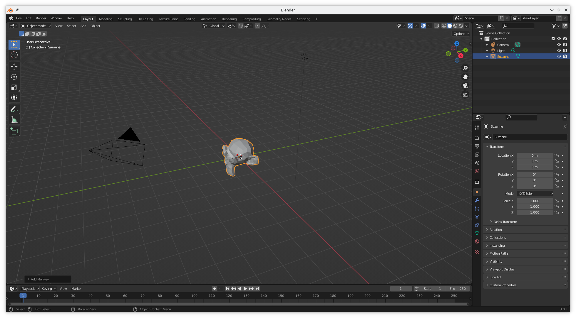 Blender is available from https://www.blender.org/ (opens new window), and mastering Blender is a topic for another book, so we will do the most basic thing possible. Remove the original cube (select the cube with the left mouse button, pressshift + x, select Delete), add a mesh (from the keyboard shift + a, select Mesh), and select to add a monkey (select Monkey from the list of available meshes). There are a number of video tutorials demonstrating how to do this. The resulting Blender user interface with the monkey head scene can be seen below.