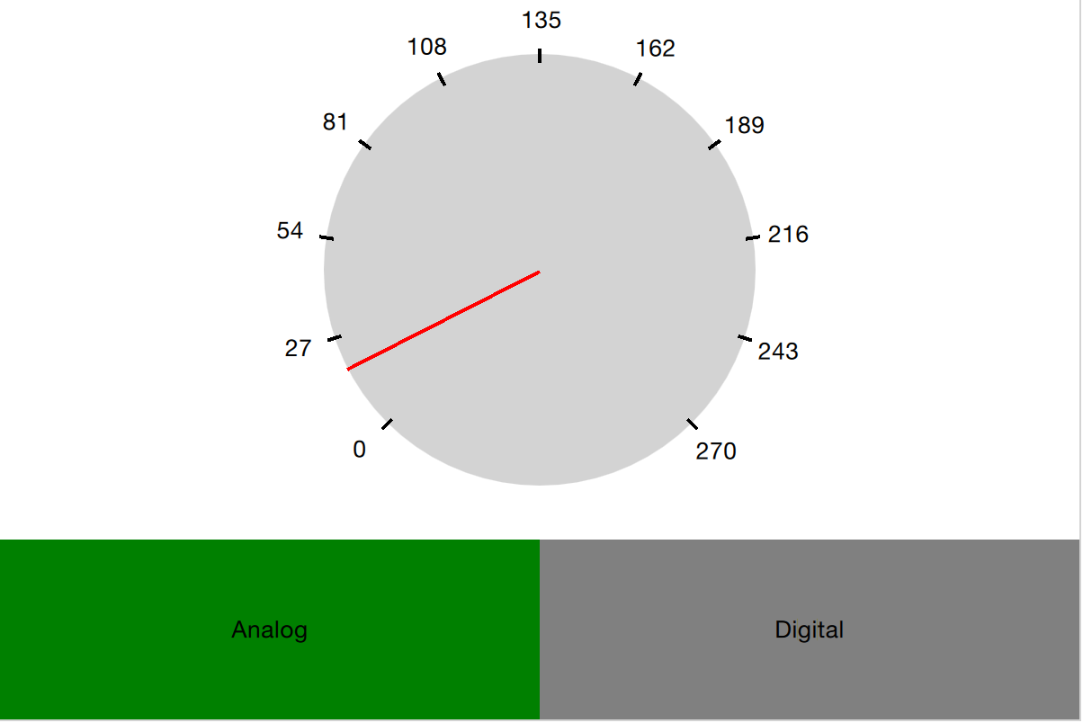 The example described below demonstrates how two separate user interface parts can be loaded into the same space using a Loader element. The idea is to have a speed dial that can be either digital or analog, as shown in the illustration below. The code surrounding the dial is unaffected by which item that is loaded for the moment.