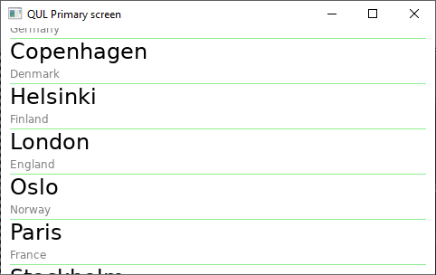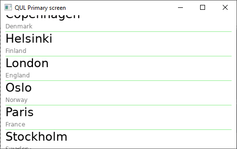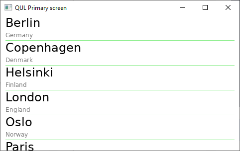 }Once the data type has been prepared, we declare the CityModel struct, inheriting from Qul::ListModel. This lets us define a model that can be accessed from QML. We must implement the count and data methods, which are similar, but not identical to, the corresponding methods from the QAbstractListModel class. We also use the `CMake macro qul_target_generate_interfaces to make the types available to QML.