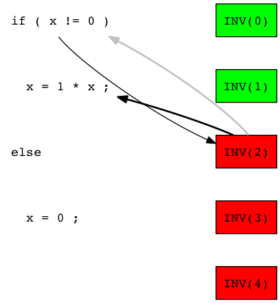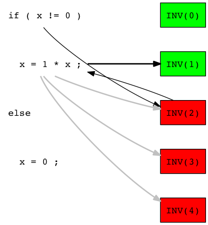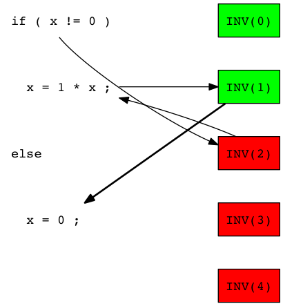 The test 'INV(1)' is passed, so we suppose that a source code line which is not executed by this test is responsible of the error. We select then 'x = 0;' as next candidate: