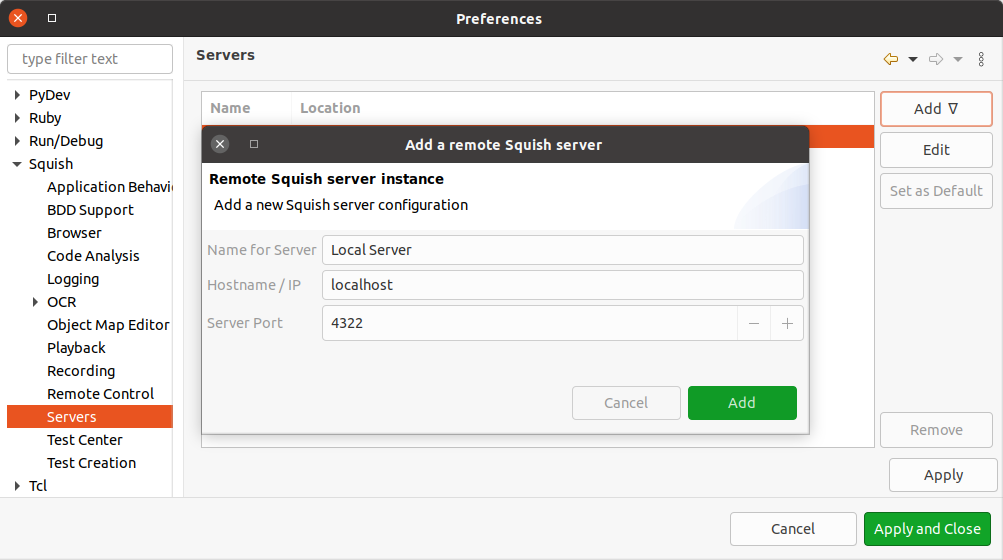 - Add remote machine's IP address and port as a remote server from Edit > Preferences (Mac: Squish > Preferences) > Squish > Servers > Add > Remote Server and select the desired server from the list