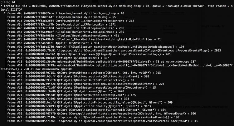 Another approach can be used when debugging AUT crashes. For that, we don't need to attach to running application process. All analysis can be done a post-mortem. Detailed recipe can be found in How to get a backtrace on Unix with the bash or tcsh shell article.