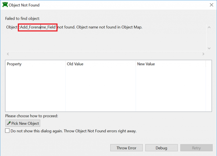 Standard set of object properties will be selected and wrote into the "Object Not Found" dialog.