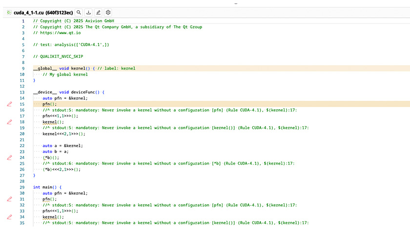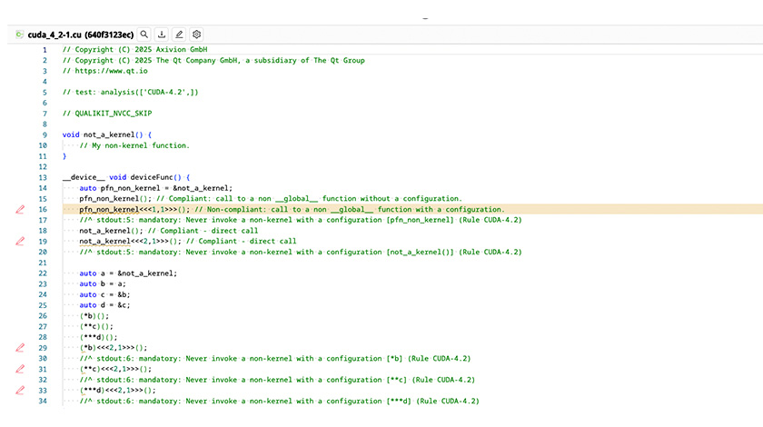 The solution: extend automated checking to CUDA. Tools providing automated checking for standard C and C++ have become ubiquitous and as a first, Axivion CUDA NCCG Analyzer can automatically enforce the above CUDA-4.1 rule as well as the rest of the NCCG. When integrated into the CI&CD environment, Axivion reports violations back into the change request as annotations for the author or reviewer.