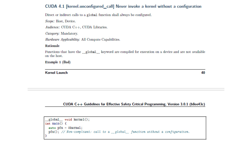 With the recent publication of NVIDIA's CUDA C++ Guidelines for Safety-Critical Programming, an official set of coding guidelines covering CUDA development has become available. With the guiding principle of safety and security engineering being “if it is available, you have to apply it”, not only new but existing projects will be best served by implementing these rules in their code bases to meet safety and security mandates.