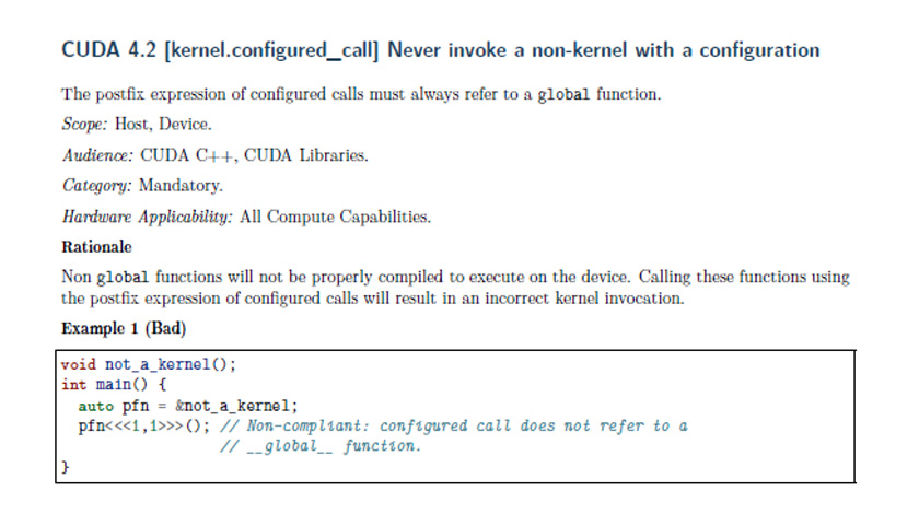 As CUDA plays an ever-bigger role in these environments, the user community needs clear, enforceable coding rules to ensure not only performance and efficiency but reliability and safety as well.
