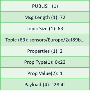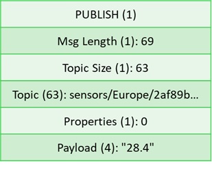 请注意消息的topic始终作为字节流的一部分并且以明文形式未加任何压缩地发送。例如,报告温度值的传感器网络可以采用如下层次结构的topic