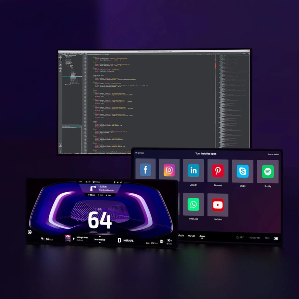Outrun HMI概念不断发展,以反映新的汽车趋势,包括新的技术进步,并展示 Qt框架的功能。 在过去的几个月中,我们加入了许多新功能,使其更接近于量产级汽车 HMI。除了地图和导航,现在还可以访问第三方应用程序,为乘客屏幕的专用功能铺平道路。我们还将Outrun与Android Automotive 进行了充分集成,以展示Qt for Android Automotive的功能。